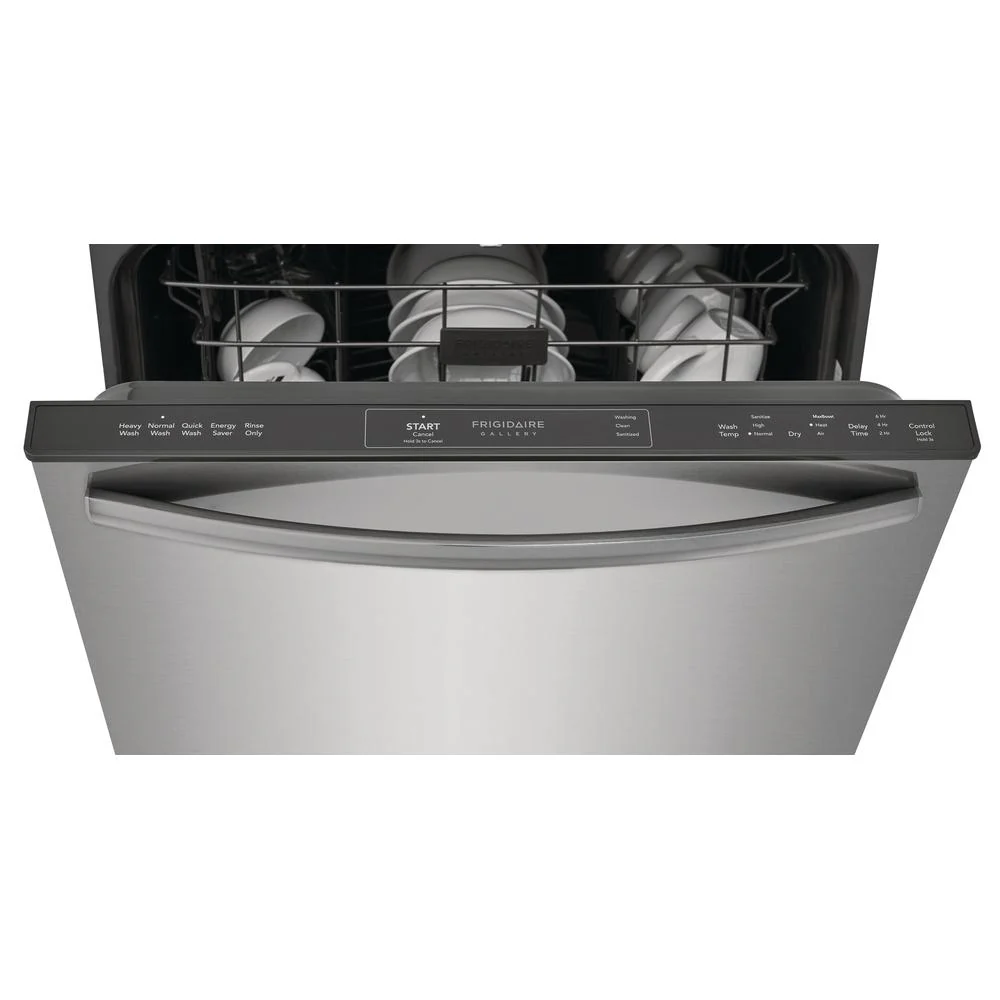 Le lave-vaisselle à commande dissimulées de Frigidaire Gallery est doté de 5 programmes de lavage, d'un panier à couverts, indicateur d'état au plancher et peut accommoder jusqu'à 14 couverts.